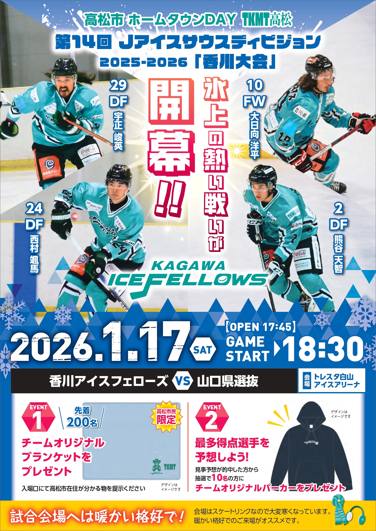 2026年1月17日(土)、第14回jアイスサウスディビジョン2025-2026 香川大会『高松ホームタウンDAY』を開催いたします。